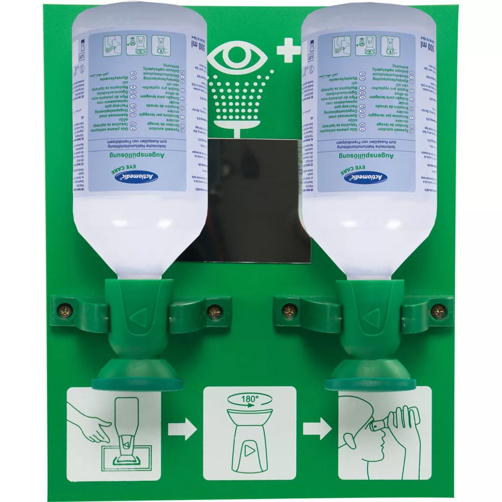 Szemkimosó állomás két palackkal, fali tartóval. Használatra kész, steril palackok, ergonomikus öblítőfejjel és porvédő kupakkal. Piktogramos használati utasítás táblával és tükörrel a könnyű kezelhetőség érdekében. Rögzítéshez szükséges csavarokkal + sürgősségi szembaleseti tervvel. 2 x 500 ml 0.9% nátrium-klorid oldattal. Öblítési idő: kb. 10 perc (össz.). Eltarthatóság: 3 év.