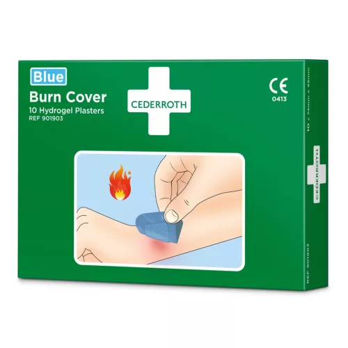 Hidrogél sebtapasz, amely védi és hűsíti az enyhébb égési sérüléseket. Az égési sérülésekre kifejlesztett sebtapasz kék, így élelmiszerfeldolgozó munkahelyeken is használható. A hidrogél nem ragad bele a sebbe. Vízálló és steril. Tartalom: 10 sebtapasz (74 x 45 mm).